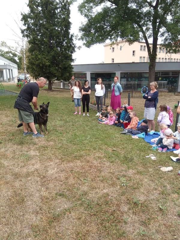 V červenci k nám zavítali psovodi Policie ČR. Děti měly možnost se blíže seznámit s prací policejních psů a shlédnout ukázku z některých policejních zásahů. Dověděly se více o péči a výcviku takových psů. Děti měly spoustu otázek a z ukázek byly nadšené.