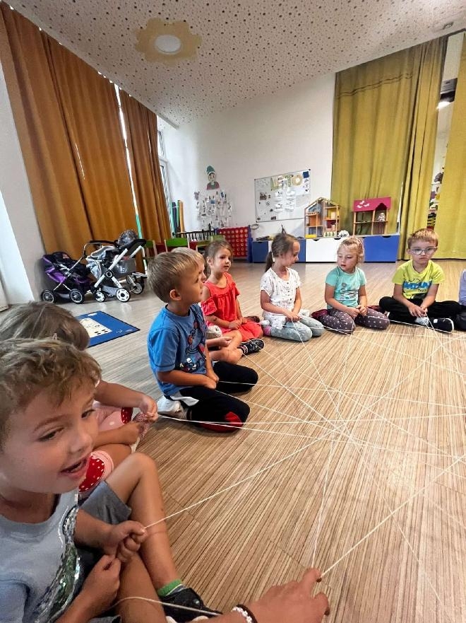 Na začátku nového školního roku se děti seznamovaly s novými kamarády a pravidly, které ve školce dodržujeme. Naučili jsme se pracovat s emocemi a ukázali si, jak se chovat nebo nechovat v určitých situacích. Nakonec děti za poslechu hudby vyjadřovaly své pocity na papír.